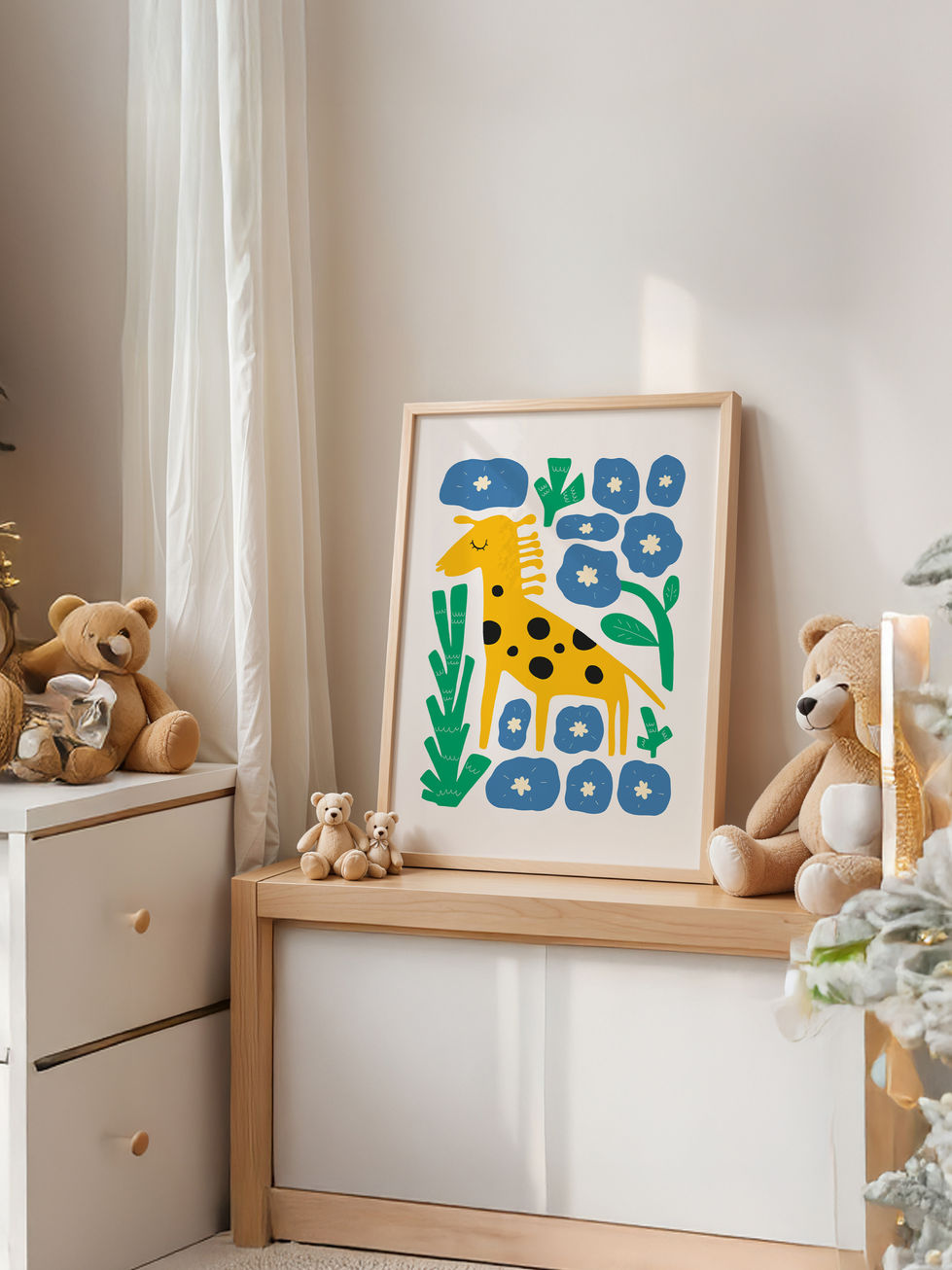 Rengarenk çiçeklerle süslenmiş bu zürafa illüstrasyonu, çocuk odalarına canlılık ve pozitif enerji katar. Eğlenceli detayları ve yumuşak çizgileriyle doğa temalı dekorasyonları seven aileler için sevimli bir seçenek sunar