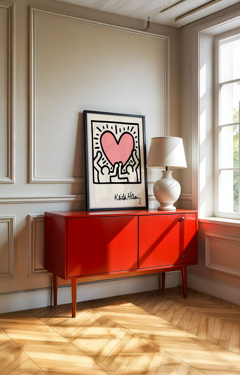 Keith Haring’in ikonik kalp figürü bu tasarımda sevgi ve birliktelik temasını öne çıkarıyor.