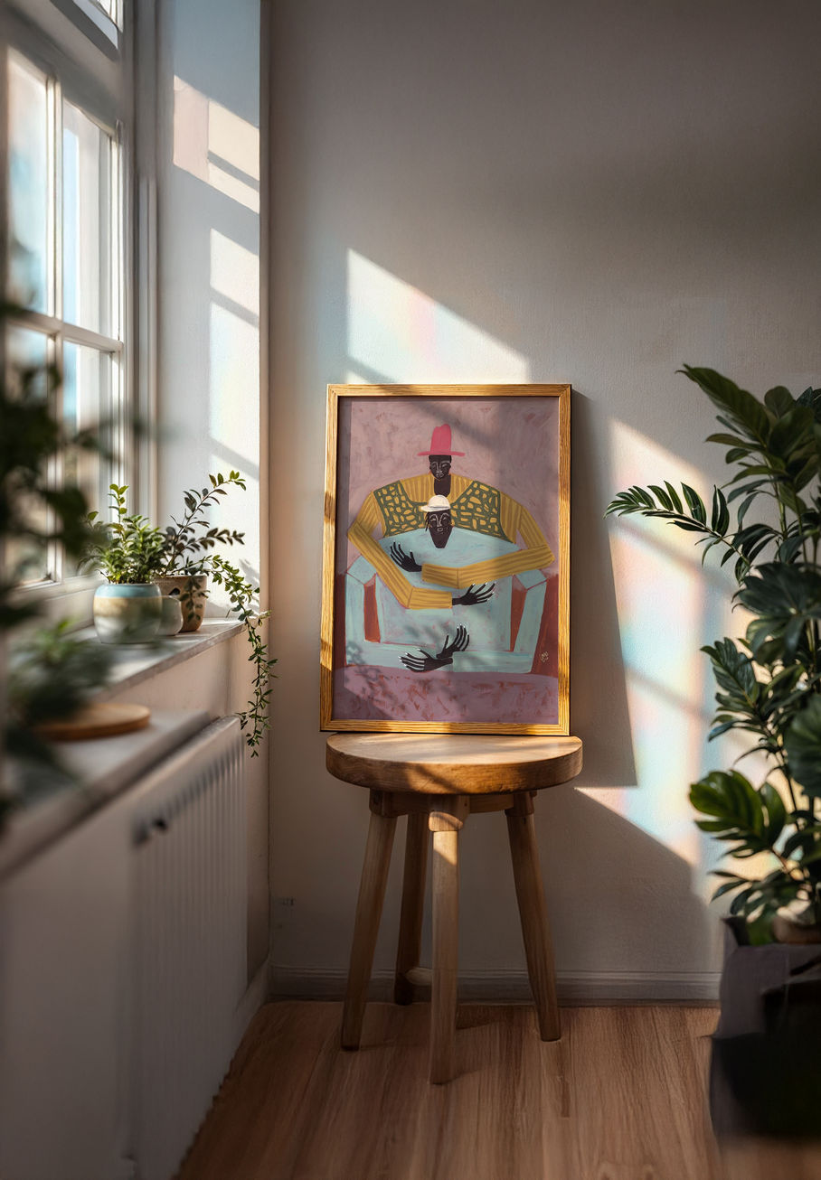 Soyut biçimlerle iç içe geçmiş figürler, güç ve bağlılık hissini çağdaş bir dille sunar.